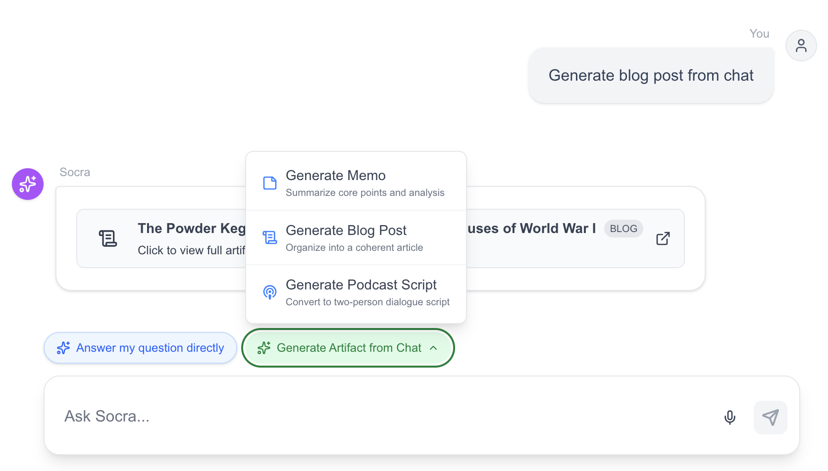"My best ideas come from debating my AI partner. Socra transforms my messy thoughts into clear artifacts."